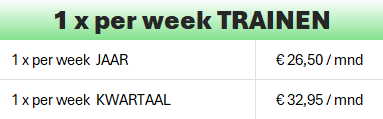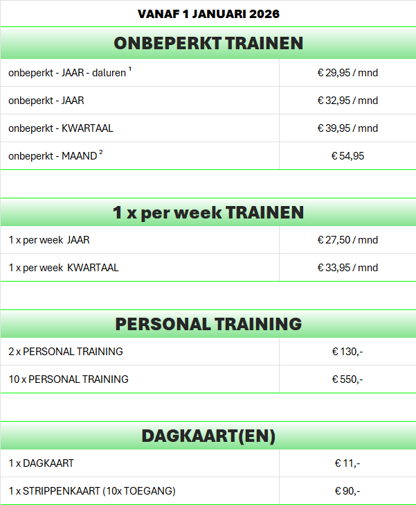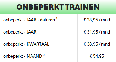 ¹ Met het abonnement - JAAR - daluren kunt u trainen op werkdagen tussen 13:00u en 18:00u. Uitgesloten zijn dus ochtenden, avonden en weekenddagen.